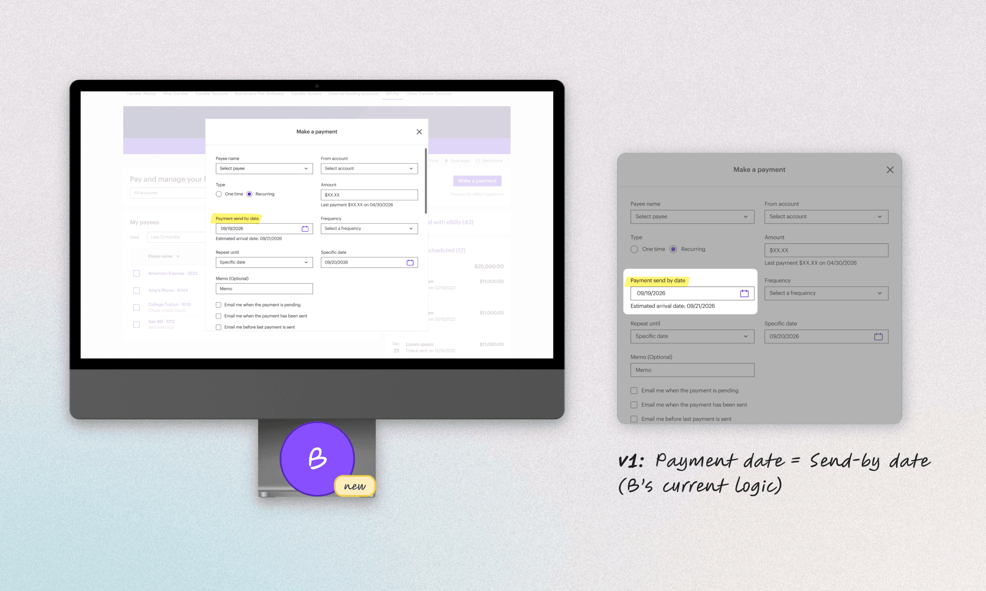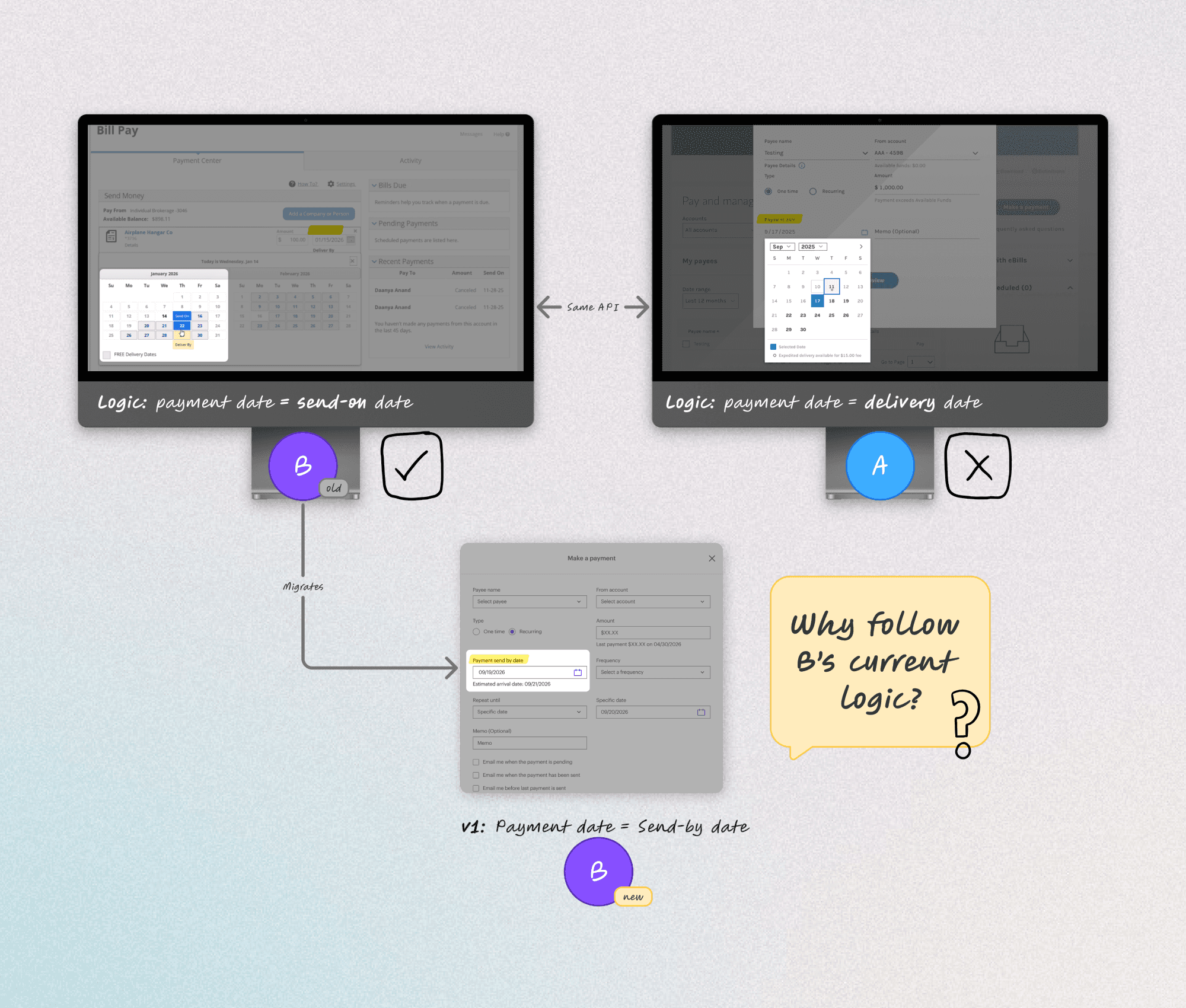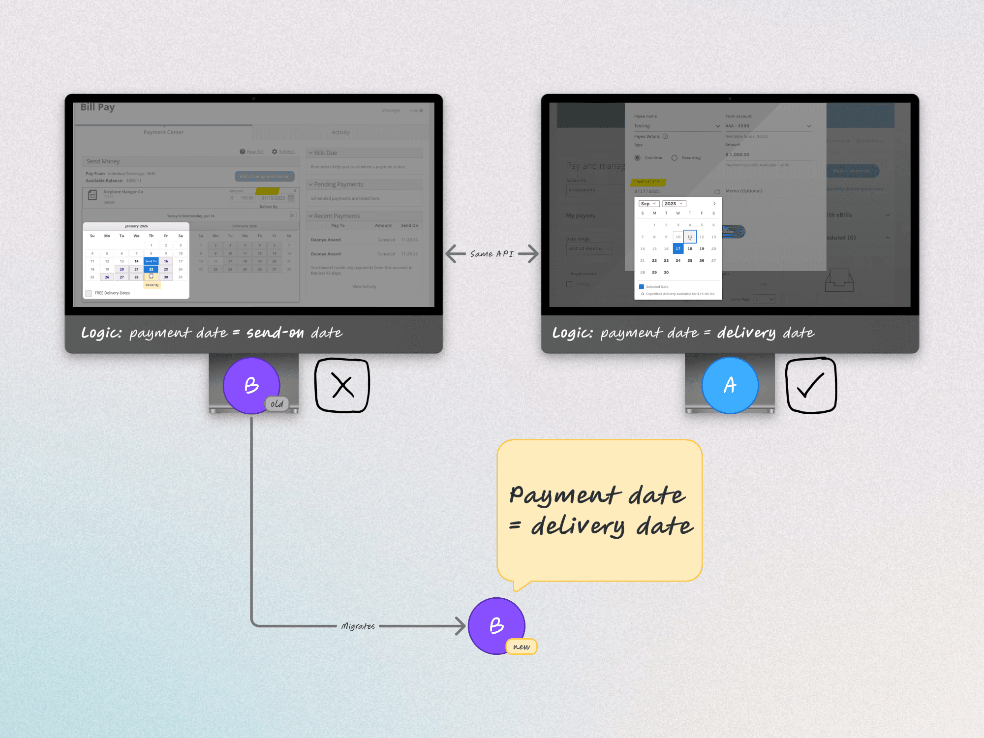 The team assumed we'd follow Platform B's logic for the migration: Let users pick send date, calculate arrival date as send + 2 days (ACH) or + 5 days (check).