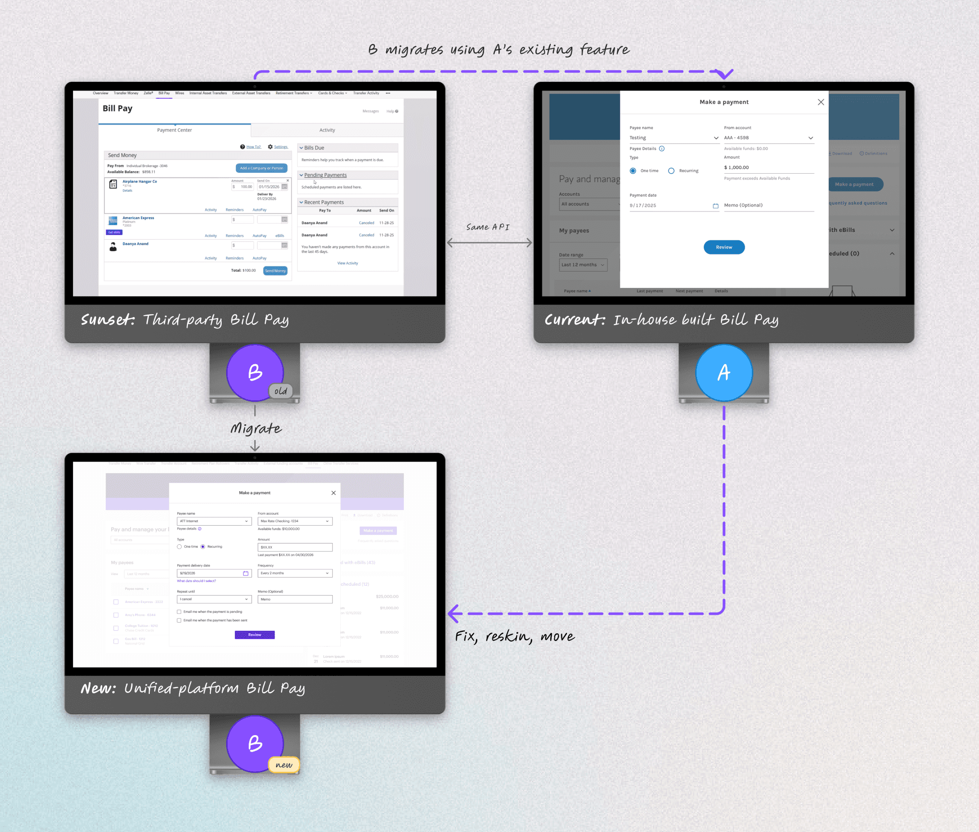 A Fortune 100 financial services firm with two major fintech platforms needed to migrate from Platform B to Platform A’s bill payment experience, while fixing late payment issues affecting high-value clients in Platform A. Surprisingly, it revealed our own team’s fundamentally misunderstood how payment scheduling worked.