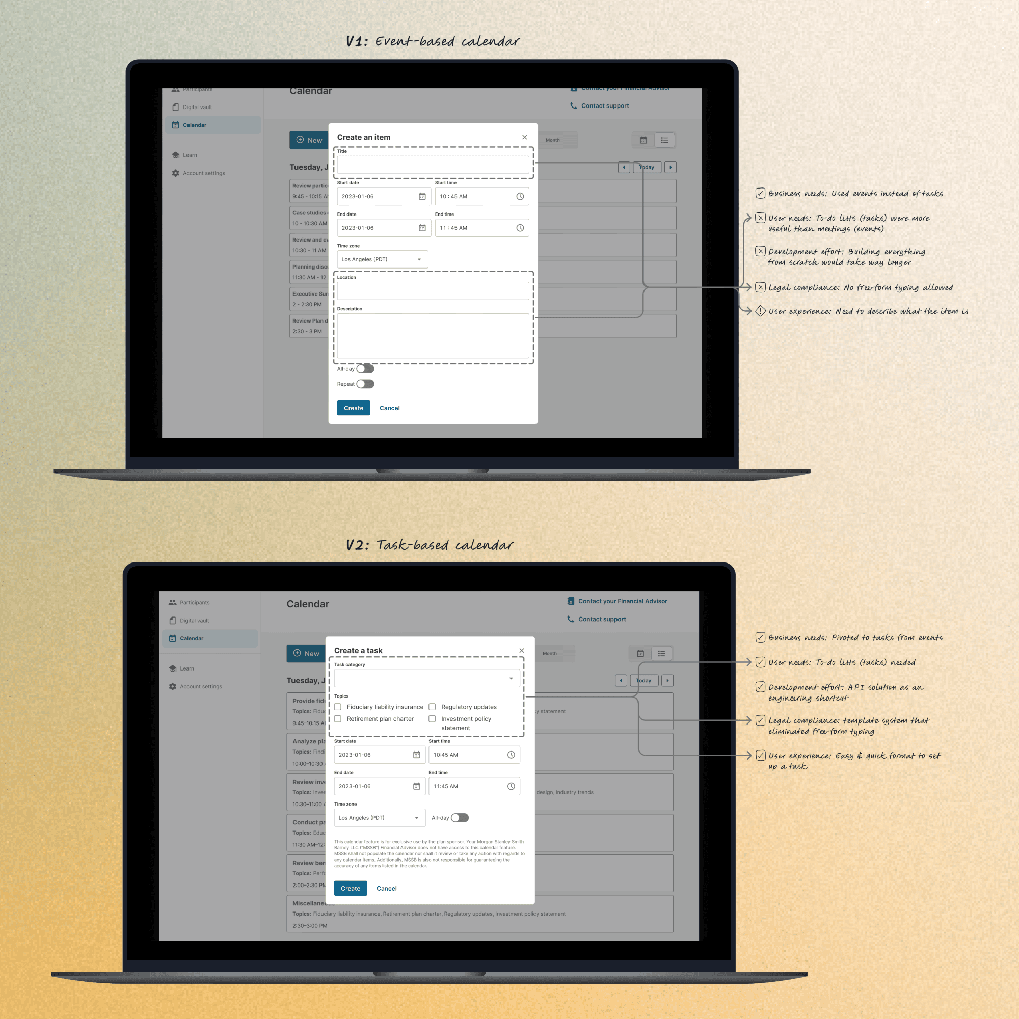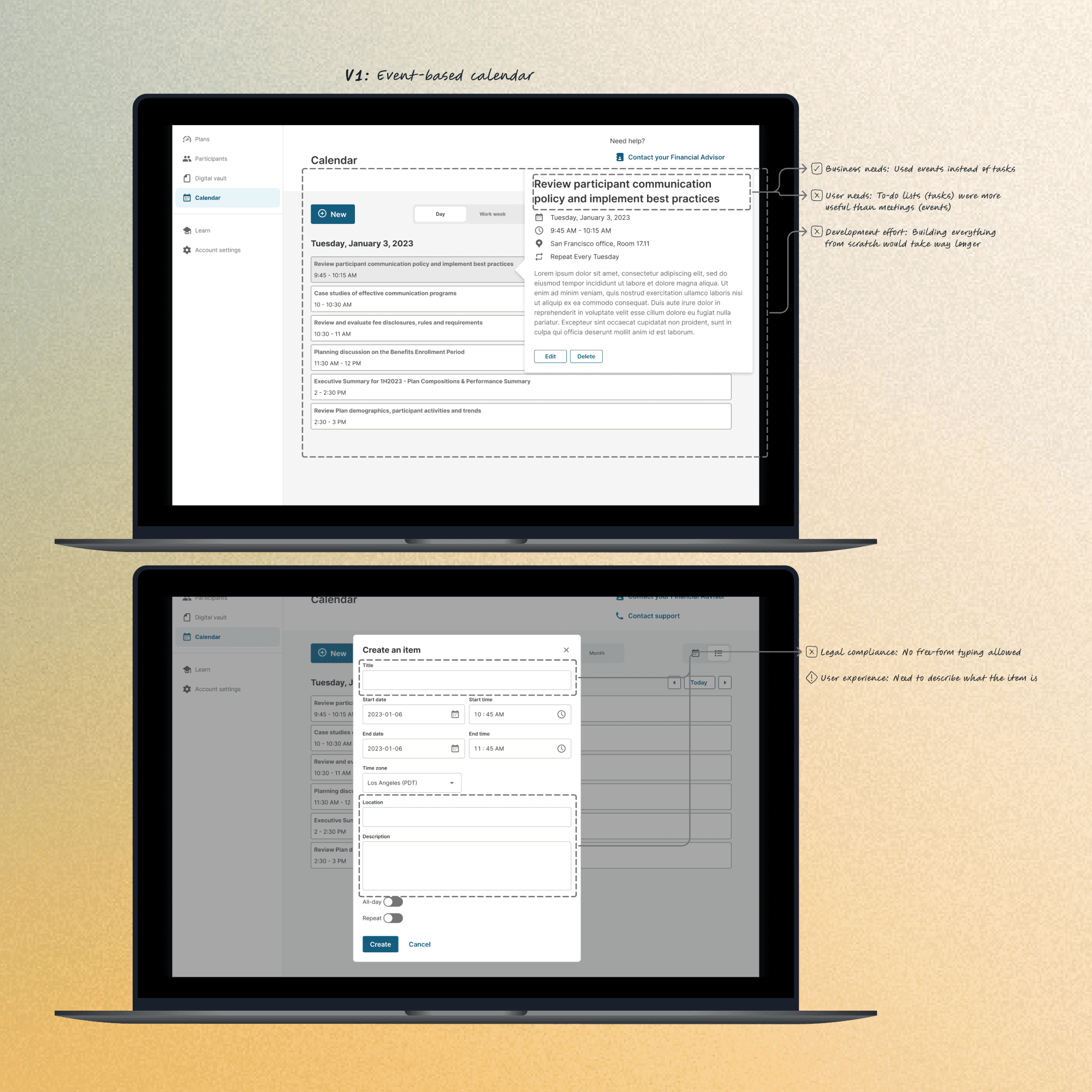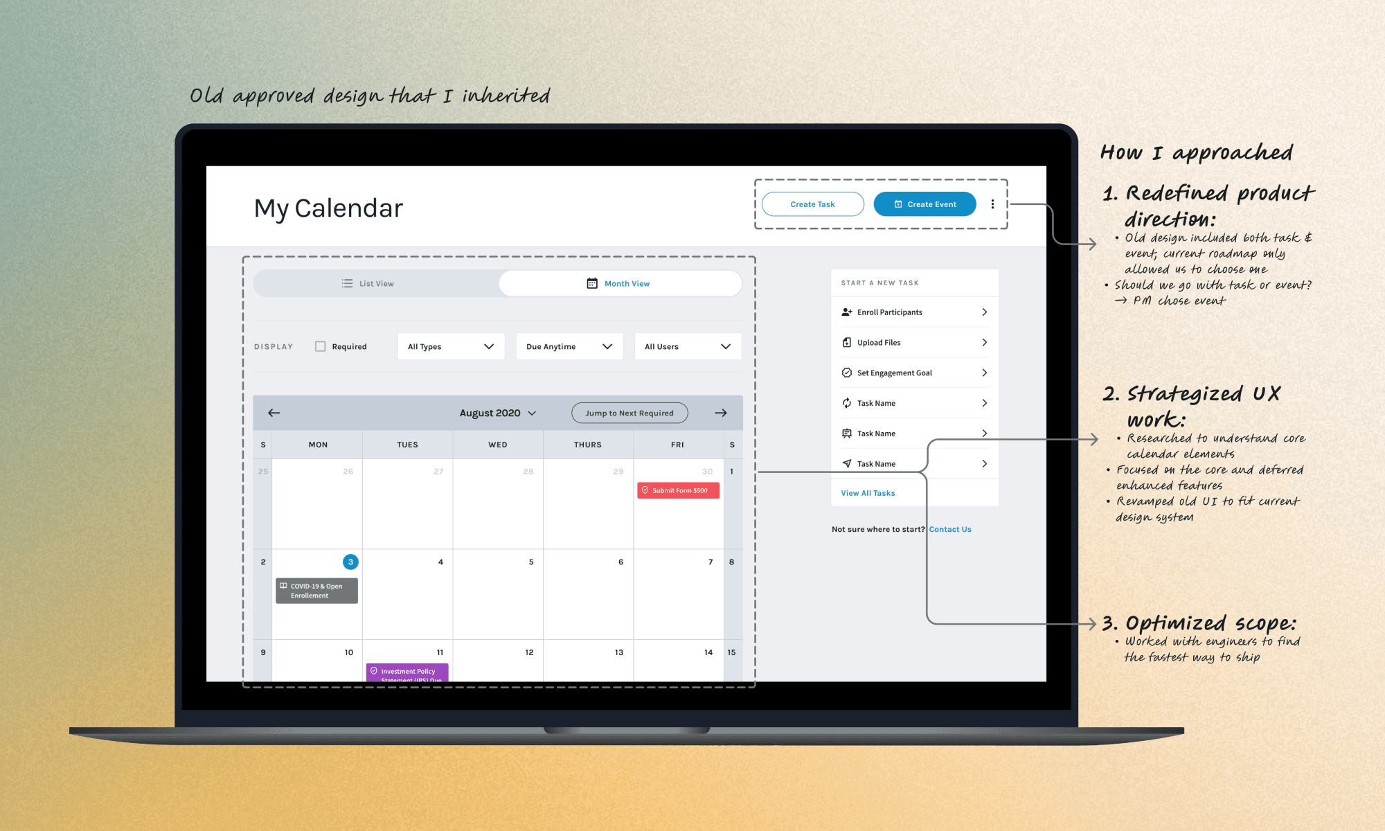 What I inherited: A 3-year-old approved design showing both calendar events and task lists. PM said "build Events" based on ambiguous examples. I had doubts but no budget to validate.