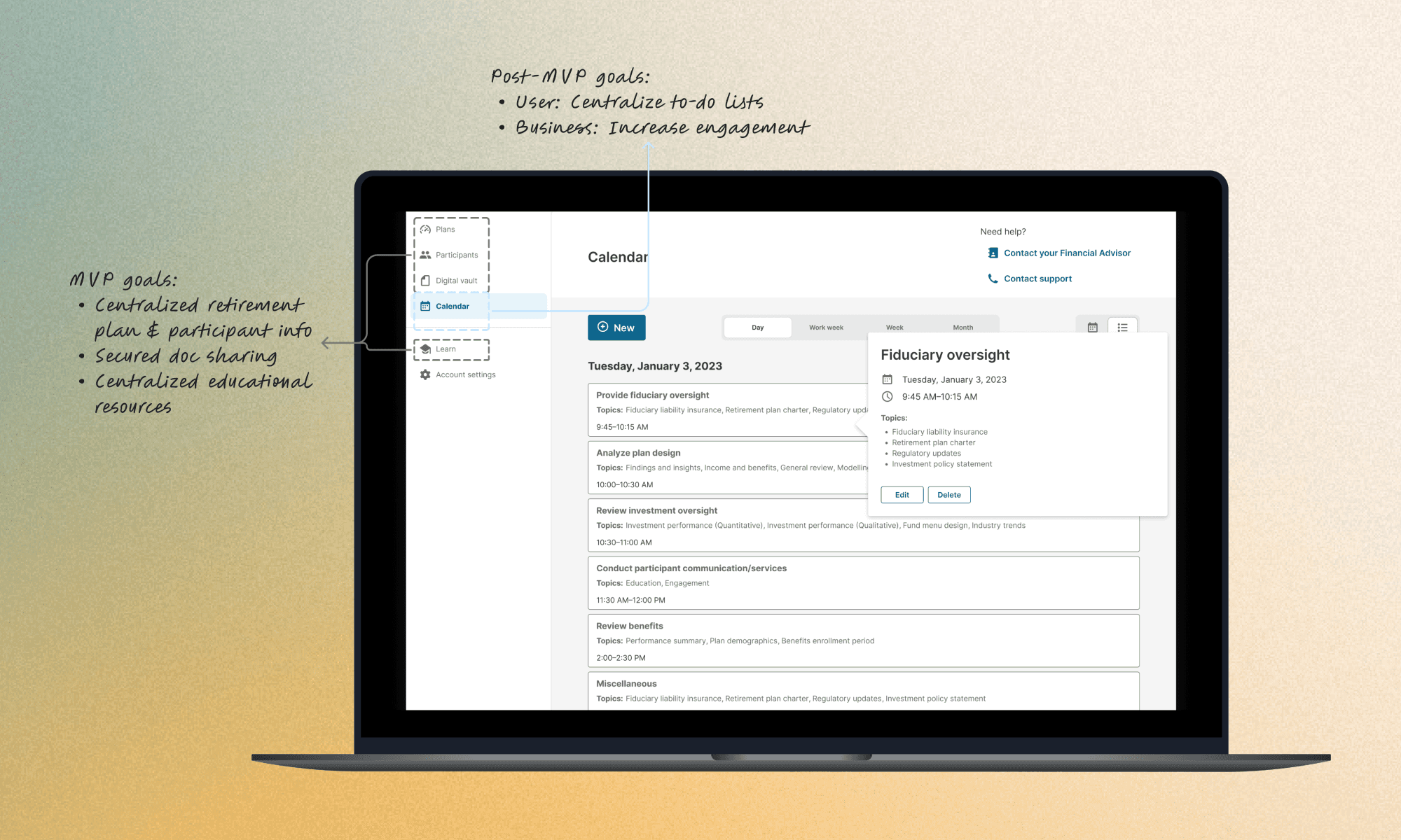 Actual challenge: People managing millions in retirement savings (plan managers) were terrified of forgetting tasks with serious legal consequences. But the industry had spent decades building software for executives and auditors—not for the people actually doing the work.